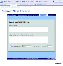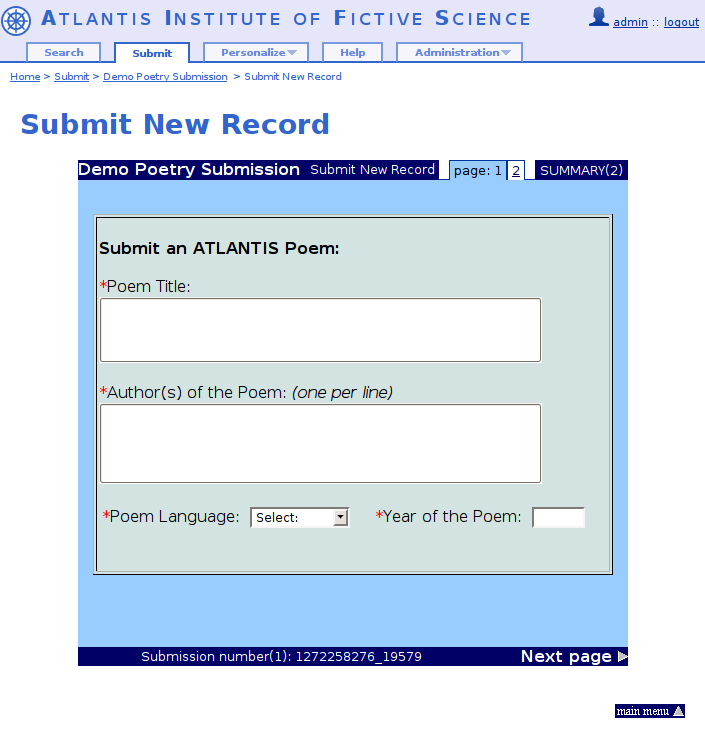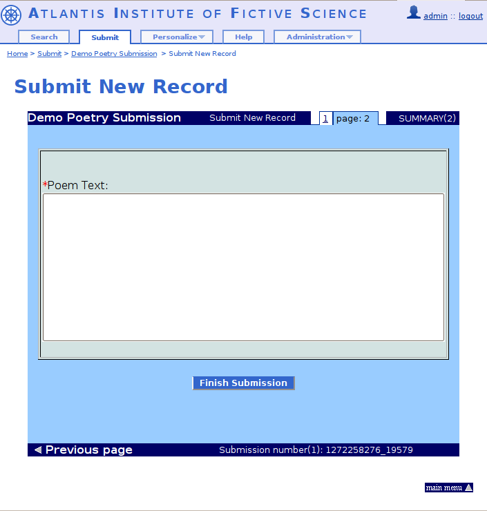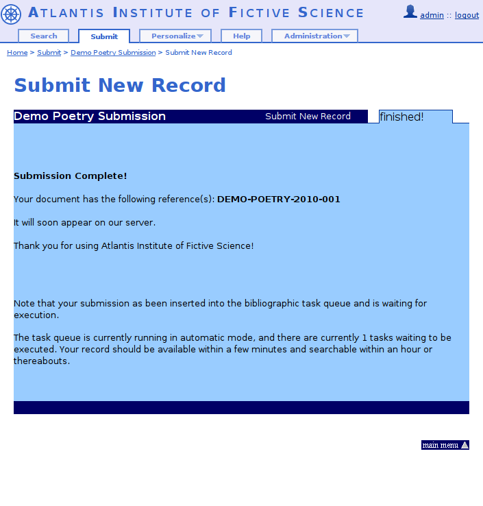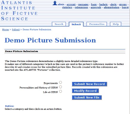 WebSubmit provides the infrastructure to set up customized pages for your users to submit new metadata and files to your repository. It is highly flexible in order to accomodate to the various type of documents that you might need to archive. As a consequence of this flexibility, it requires a good level of understanding of the concepts behind WebSubmit.