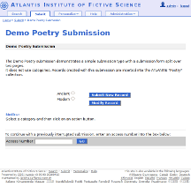 Figure 6 also shows the possibility to select among various categories prior to jumping into one of the available actions. These categories usually don't have a direct impact on the chosen workflow. Think of them simply as a simple WebSubmit element place on the first page, that is common to all the actions of your submission (indeed you could set up your submissions to have such categories inside your submission actions pages, but that would require additional work).
