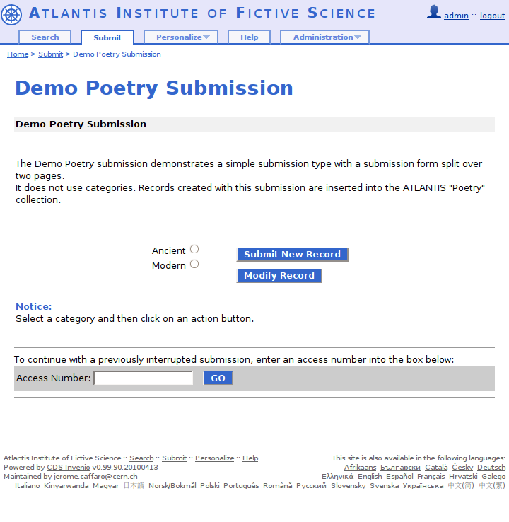 Such a multi-page submission could appear to users as shown in figure 4. Note that this figure shows a special page 0. This "cover" page is mandatory for all submissions, and is automatically generated by WebSubmit. It can be customized to 1) display a description of the submission, 2) show the available "actions" (described further below) and 3) let the users chose among the available "categories" (described further below).