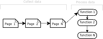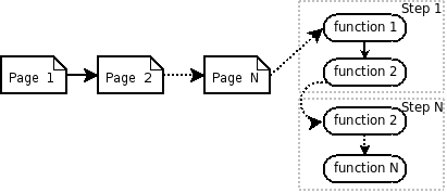 A simplied schema of a typical WebSubmit workflow is the following one (figure 1): one or several pages are presented to the user to enter some information, such as title of the document, authors, etc. Each of these pages contain a form with one or several WebSubmit elements, which can either display some information to the user, or ask for input from the user. WebSubmit elements are described more in detailed further below. After the user has finished filling the forms on all pages, a series of WebSubmit functions are called. These functions will typically (1) post-process the data, (2) create a MARCXML, (3) upload the created MARCXML file, and (4) send confirmation email(s).