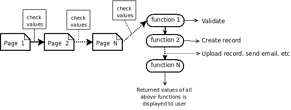 One thing worth to learn from this simple workflow is that (1) functions are executed one after each other, (2) that each function can have side effects, such as sending email, and that (3) the output of these functions is displayed to the user. Typical submissions use many side-effect functions, and only one function that give some feedback to the user (in the form of a web page). Also most submissions usually need only a single page.